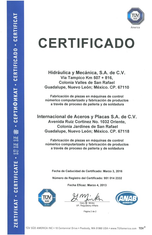 Hidráulica y Mecánica, S.A. de C.V. fundada desde 1984, es una empresa del giro metal mecánico, dedicada a la transformación de materiales para productos de los diferentes sectores como: Aeroespacial, electrónico, minero, siderúrgico, industria del petróleo y de la construcción; damos apoyo directo al desarrollo de su ingeniería y necesidades de producción.